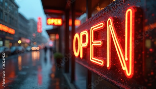 Neon open sign illuminates rainy urban street at dusk. Shop entrance glowing with vibrant red, yellow lights on wet night. Bokeh effect in background creates moody atmosphere, evoking vintage retro
