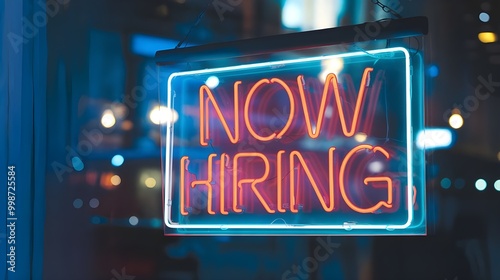 neon, signs, hiring, job, opportunity, career, recruitment, employment, business, store, shop, window, display, advertisement, advertising, marketing, promotion, city, night, urban, modern, light, glowing, bright, colourful, red, blue, blur, bokeh, graphic, design, typography, text, concept, abstract, background