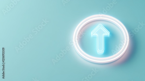 Neon Up Arrow Symbol in Circular Frame on Soft Blue Background in Modern Digital Style