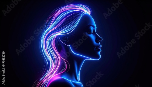 glowing, profile, woman, head, neon, light, line, abstract, digital, artistic, design, silhouette, vibrant, colours, pink, blue, purple, hair, style, beauty, face, dark, background, illustration, graphic, modern, art, contemporary, shape, energy, smooth, curve, outline, artwork, female, portrait, light, digital artwork, futuristic, technology, science fiction, fantasy, surreal