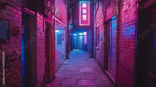 Neon-lit alleyway at night. Pink and blue hues illuminate brick walls, doors, and a glowing Asian sign. Atmospheric, mysterious, urban scene.