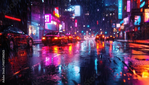 rain, night, city, street, neon, light, wet, car, puddle, reflections, vibrant, colourful, urban, dark, illuminated, traffic, building, store, signs, modern, blur, movement, transport, transportation, rainy, glow, pink, purple, blue, yellow, illumination, city landscape, evening, art, digital, illustration, photorealistic, perspective, driving, vehicle, horizon, view