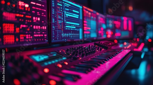 music, studio, synthesizer, keyboard, monitor, screen, display, audio, waveform, neon, light, pink, purple, red, blue, technology, digital, production, mixing, recording, editing, composition, sound, design, interface, control, panel, key, instrument, electronic, contraption, equipment, workspace, desk, night, dark, colourful, vibrant, modern, futuristic, professional, artist, creative, innovation, inspiration