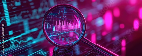 Neon-themed business data analysis with magnifying glass for SEO insights.