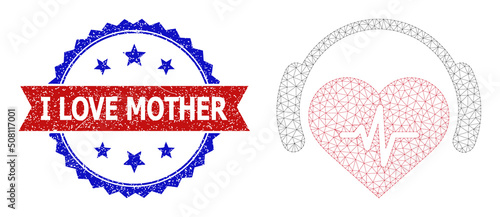 Network heart sound polygonal model icon, and bicolor unclean I Love Mother seal stamp. Red stamp seal has I Love Mother title inside ribbon and blue rosette.