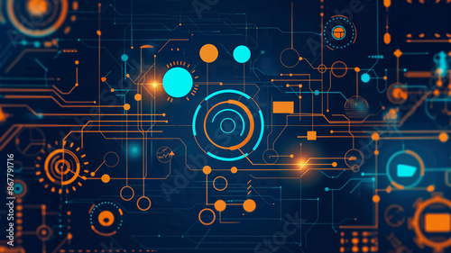 digital, solution, operation, interface, interconnected, circuit, node, futuristic, blue, orange color, network, advanced technology, datum, processing, electronic, component, circuitry, illustration, technology, cyberspace, design, software