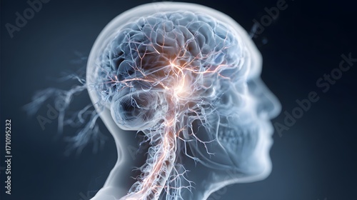 neural network visualization showing active brain neuron connections with electric impulses and red energy signals