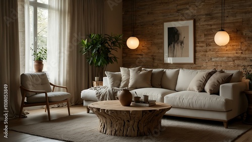 Neutral-toned, cozy living room with natural textures and soft lighting.