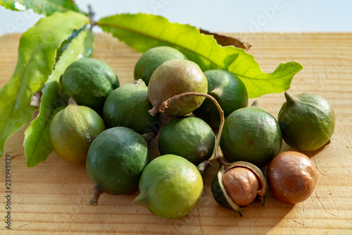 New harvest of ripe fresh Australian macadamia nuts in shell with leaves