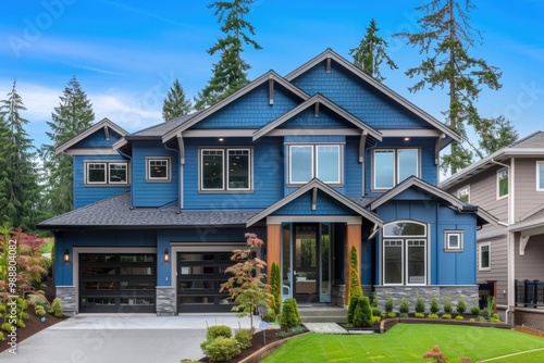 New Home For Sale. Luxurious New Construction Home in Bellevue, WA with Modern Blue and Grey Exterior