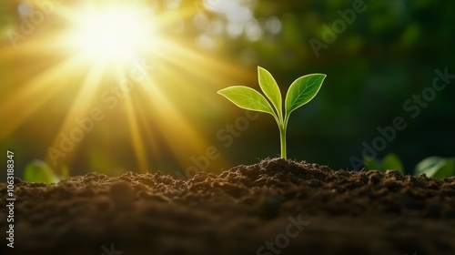 New life begins, a young plant sprouts in the sunlit soil, reaching for the sky with vibrant green leaves.