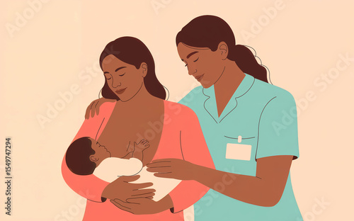 breastfeed, mother, baby, newborn, nurse, support, health care, lactation, adviser, infant, bonding, nursing, maternal, care, family, motherhood, midwife, gentle, love, parenting, compassion, woman, hospital, nurturing, health, emotional, warm, trust, comfort, wellness, guidance, illustration, serene, soft