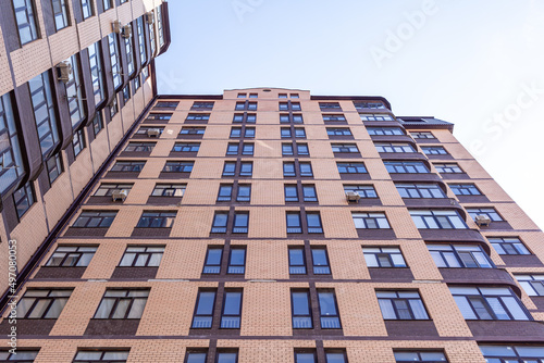 New multi-apartment high-rise buildings made of brick. Apartments with repairs, windows and air conditioning. The neighborhood of new houses.