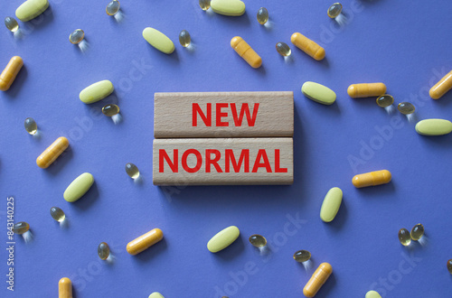 New normal symbol. Wooden blocks with words New normal. Beautiful purple background with pills. Medicine and New normal concept. Copy space.