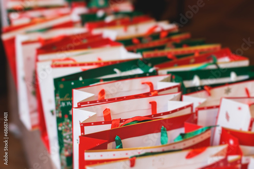 New Year corporate gifts and souvenirs for company employees, Christmas party surprise gift bag, gift giving at office work, red green and white paper bags, presents exchange with colleagues at work