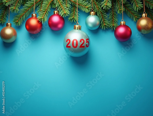 New Year's bright gradient background with hanging pine branches and ornaments, one with "2025", plenty of copy space for a banner