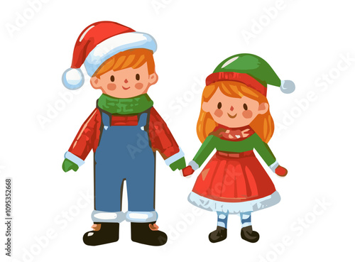 boy, girl, children, christmas, postcard, happy new year, vector, illustration, brother, sister, holiday, couple, joy, children, children, people, children, family, love, cartoon, art, fun, group, childhood, friends, set, dress