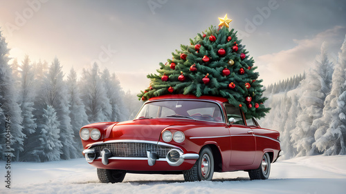 New Year's toy red car is carrying a Christmas tree. christmas holiday concept