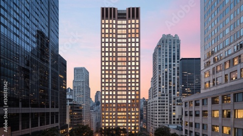 New York City skyline at sunset with modern skyscrapers. Urban landscape with illuminated windows and colorful sky.