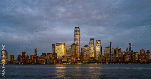 New York City skyline. NYC skyscrapers. Manhattan skyline at dusk. NY cityscape with lights. Night in New York. NYC night cityscape. Downtown Manhattan. New York at twilight. American city skyline.