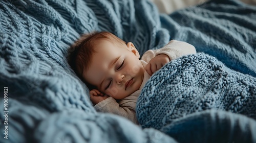 Newborn baby boy in bed New born child sleeping under a blue knitted blanket Children sleep Bedding for kids Infant napping in bed Healthy little kid shortly after birth Cable knit tex : Generative AI