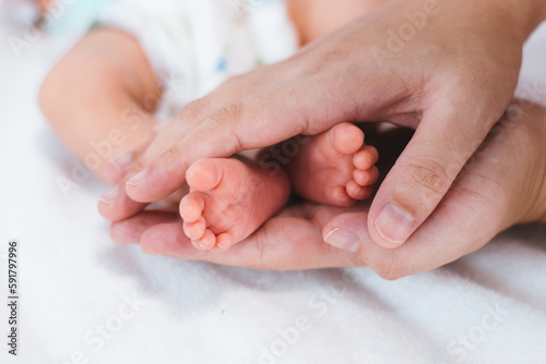Newborn baby feet on white blanket. mother hold feets of newborn baby. Cmaternity and babyhood concept.