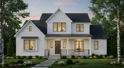 house, home, exterior, architecture, modern, farmhouse, residential, design, family, property, facades, building, construction, lifestyle, landscape, real, estate, suburban, outdoors, dwelling, structure, white, style, elegant, contemporary, living, nobody, porch, siding, window, entrance, path, grass, garden, yard, plant, residence, greenery, peaceful, development, ownership, quiet, location