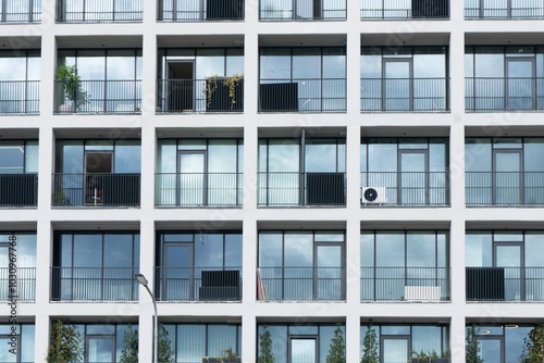 Newly built modern apartment building with glass apartments and balconies. Large windows block of flats. Stylish urban landscape. Futuristic architecture.