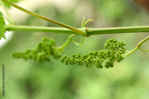 Newly formed bunches of baby Grapes. Green flowers of grape.
