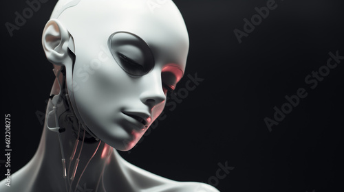 Newly manufactured augmented synthetic biomechatronic android robotic female - ultra futuristic depiction of possible artificial intelligence replacement of humans - idealistic science fiction.