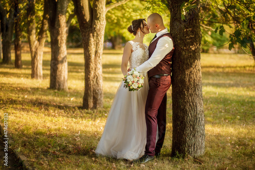 Newlyweds walk along the trees alley in the park. Wedding walk of the bride and groom at sunset. Newlyweds stand a corridor of trees. Beautiful kiss of the bride and groom.