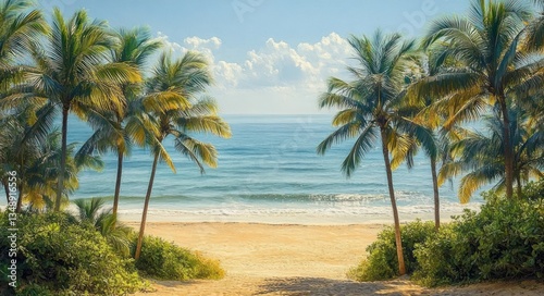 Nha Trang Beach Scene with Palm Trees and Deck Chairs Under the Sun