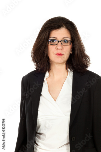 woman, isolated, white, background, white background, adult, portrait, studio, goggles, eyeglass, female, natural, caucasian, cheerful, pose, 1, person, people, face, expression, alone, jacket, serious, mother, homemaker, modern, family, blouse, brunette, hair, clothing