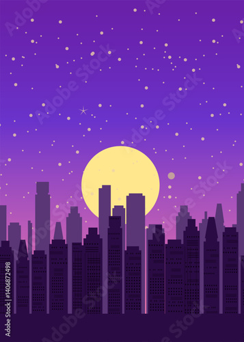 Night city poster, cityscape background with bright and glowing Moon