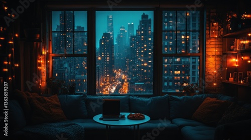 city, night, apartment, cosy, window, view, light, urban, modern, home, interior, building, skyscraper, illuminated, evening, scene, room, comfortable, sofa, relaxing, dark, teal, orange, warm, cool, glow, rustic, brick, city landscape, metropolis, illumination, downtown, street light, landscape, residential, architecture, window, night time, ambience