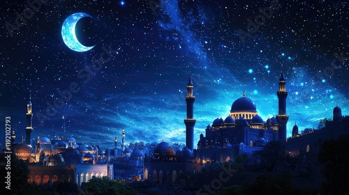 Night cityscape, crescent moon, starlit sky, mosque, Islamic culture, Ramadan greeting