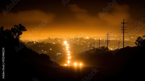 night, highway, city, light, hill, road, landscape, dark, orange, glow, darkness, scenic, silhouette, view, evening, urban, countryside, illumination, distant, traffic, street, powerline, pole, electricity, rural, suburban, atmosphere, ambience, gold, horizon, sky, tree, mountain, fog, haze, night time, photo, image, picture, scene, vista