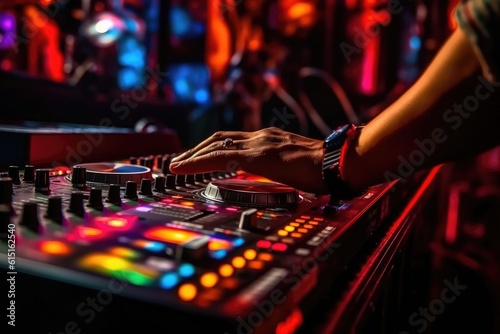 Night club, nightlife concept. DJ hands hold microphone and mixing DJ remote. Neon light, ai generated