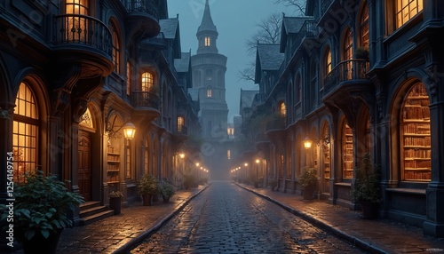 enchanted, library, night, town, street, glowing, window, fairy tale, landscape, lamp, light, old, architecture, antique, building, book, mysterious, vintage, book, fantasy, dream, art, city, concept, moon, lantern, gothic, imaginary, enchanting, romantic, ornate, fairy tale, star, artwork, digital, story, illustration, love, illumination, shadow, dark, sky, whimsical, magical, alley, urban, europa, fog, foggy