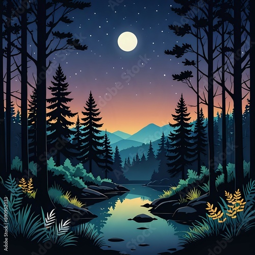 night, moon, tree, sky, christmas, winter, landscape, star, snow, vector, illustration, forest, nature, star, blue, dark, silhouette, holiday, light, christmas, pine, moonlight, tree, wood, card
