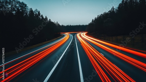 road, highway, night, long exposure, traffic, car, headlamp, rear lamp, streak, blur, motion, abstract, asphalt, tarmac, lane, line, dark, landscape, nature, forest, tree, travel, transportation, journey, speed, movement, dynamic, digital artwork, graphic design, artwork, illustration