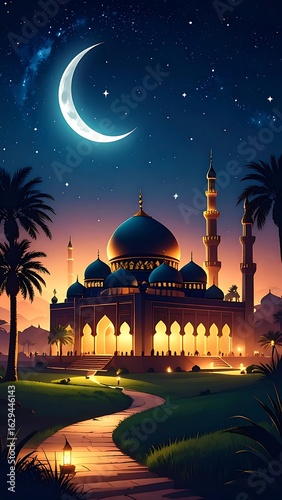 Night scene of a brightly lit mosque with a crescent moon, palm trees, and a path leading to it