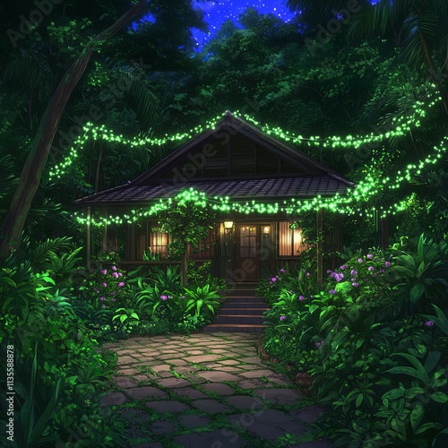 Night scene of a cozy cottage nestled in a lush, tropical garden with string lights.