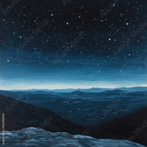night, sky, star, mountain, vale, landscape, peak, dark, blue, misty, light, light, horizon, view, panorama, deep, stillness, quiet, calm, elevation, perspective, viewpoint, nature, cosmic, astral, painting, art, detail, texture, colours, pale, white, forest, tree, rocky, mist, distant, illuminated, tranquil, serene, huge, infinite, immensity, beauty, mystery