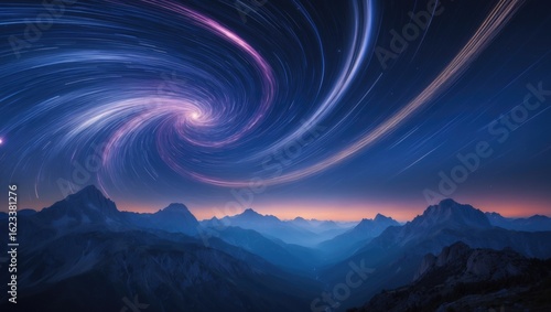 Night sky with swirling star trails over mountain range. Astronomy and celestial phenomena, cosmic storm, night landscape. The concept of astrophysics and space exploration.