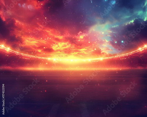stadium, night, sky, sunset, star, nebula, light, field, dark, bright, colourful, dramatic, vibrant, orange, red, purple, pink, blue, green, glowing, illuminated, atmosphere, evening, cosmic, space, fantasy, spectator, seat, arena, curved, horizon, glow, background, image, graphic, design, abstract, scene, view, perspective, empty