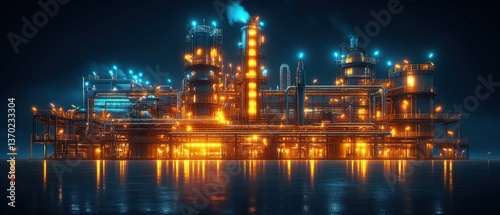 refinery, industrial, plant, petrochemical, factory, night, light, illuminated, water, dark, complex, modern, energy, production, technology, manufacturing, industry, infrastructure, power, oil, gas, chemical, processing, engineering, architecture, building, city landscape, nocturnal, orange, blue, glowing, steel, pipe, tower, tank, structure