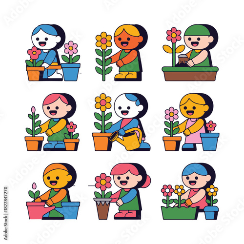 children, children, children, children, planting, gardening, flower, flower, pot, pot, watering, can, green, pink, orange, yellow, blue, brown, illustration, cartoon, character, diverse, multicultural, people, activity, hobby, nature, growth, spring, summer, simple, flat, graphic, icon, set, collection, cute, happy, joy, playful, young, small, plant, germ bud