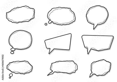 Nine handdrawn speech bubbles with rough outlines and drop shadows arranged in a grid