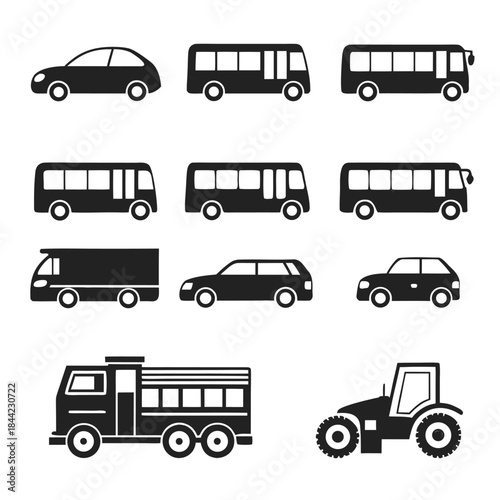 Nine Silhouettes of Diverse Vehicles on White Background Keywords car, bus, truck, tractor